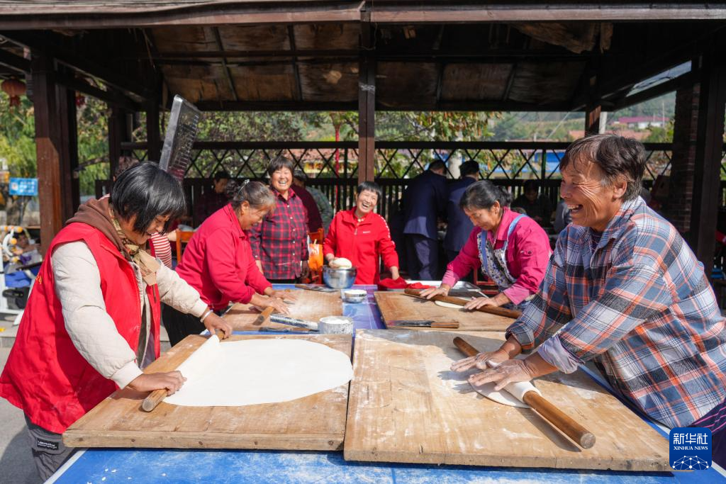 10月10日,志愿者在博山区池上镇池埠村长者食堂和老人一起包饺子。