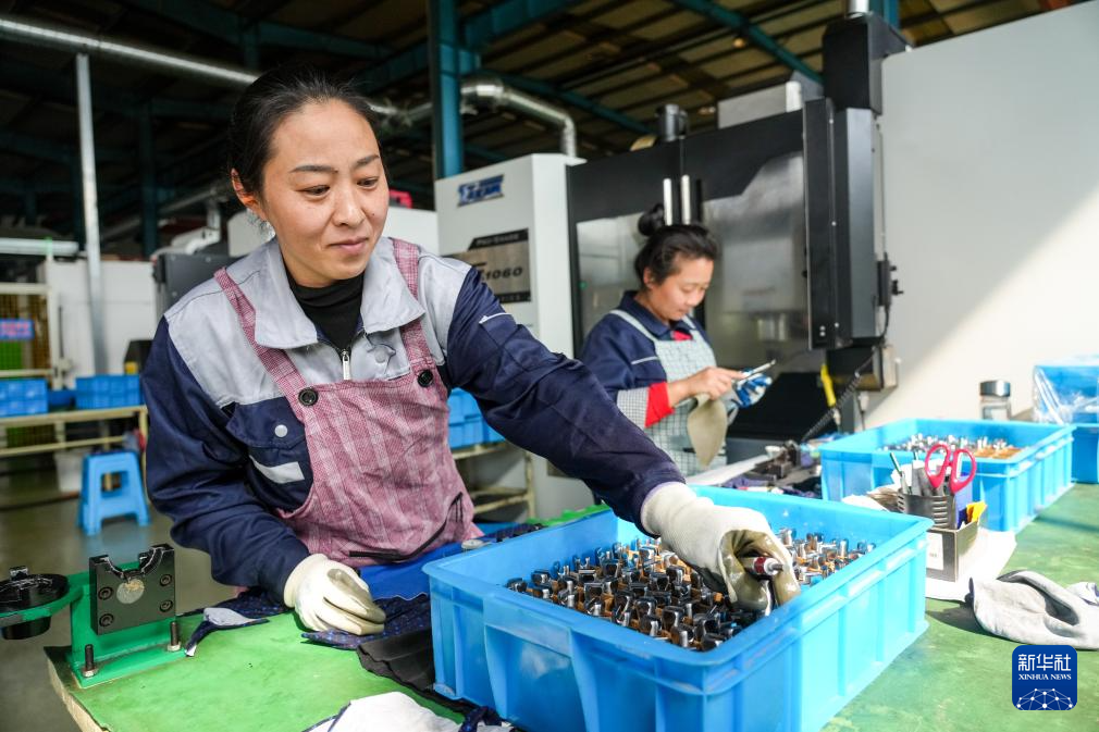 10月10日,在博山区八陡镇茂岭村机加工车间内,工人在生产机械零件。该村立足机加工传统优势发展“一村一业”,增加集体收入。