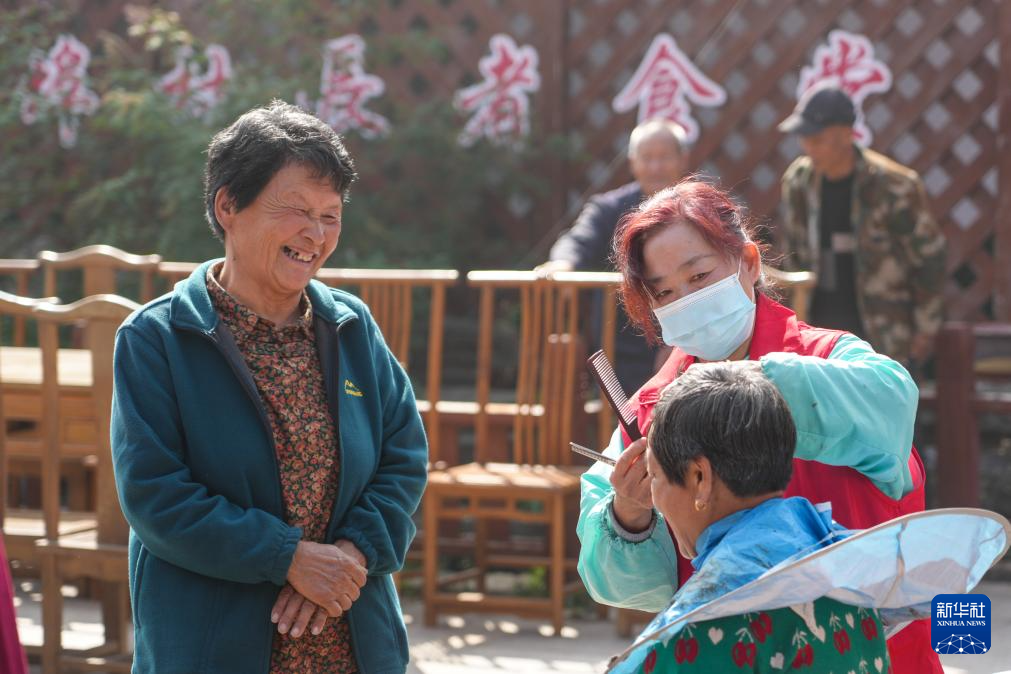 10月10日,志愿者在博山区池上镇池埠村长者食堂为老人免费理发。