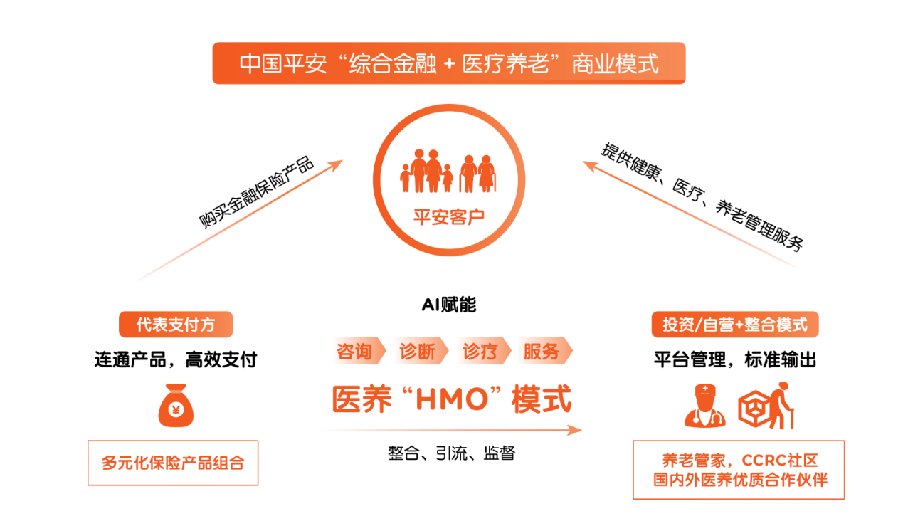 这种模式可以用一句话来总结,即“代表支付方,整合供应方”。在中国平安的高管们看来,平安在这整个体系中的角色是负责打通“支付方–专业服务–供应方”全流程的平台方,为客户提供高性价比的医疗养老服务。