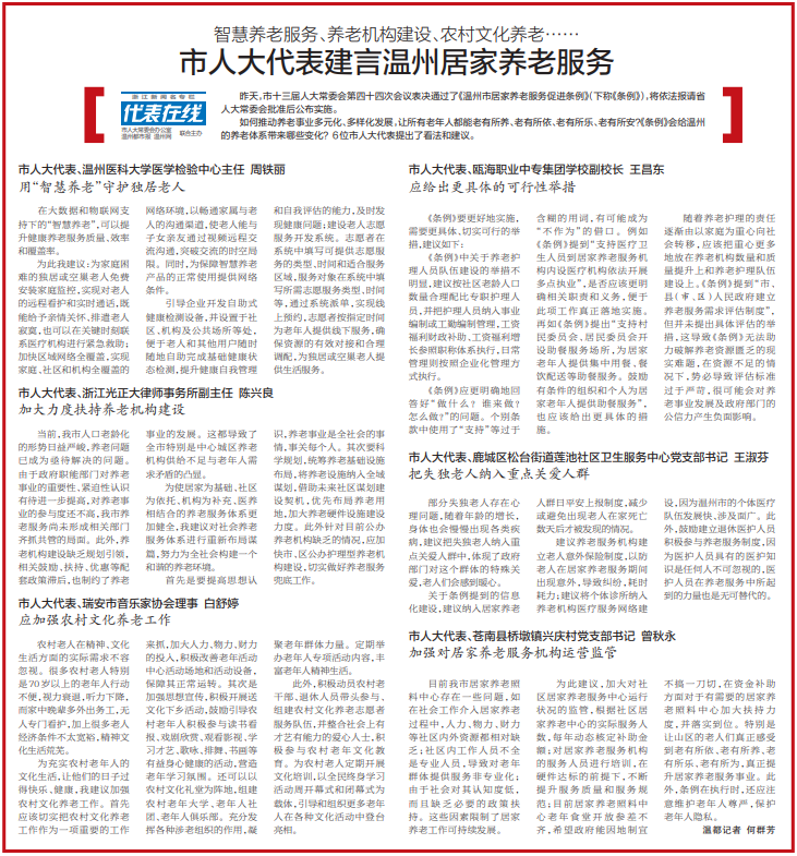 如何推动养老事业多元化、多样化发展,让所有老年人都能老有所养、老有所依、老有所乐、老有所安?《条例》会给温州的养老体系带来哪些变化?6位市人大代表提出了看法和建议。