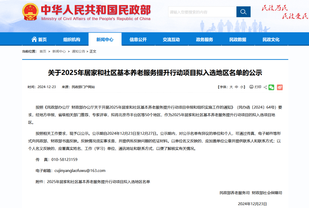 按照《民政部办公厅 财政部办公厅关于开展2025年居家和社区基本养老服务提升行动项目申报和组织实施工作的通知》(民办函〔2024〕64号)要求,惠州保洁13825404095经地方申报、省级相关部门推荐、专家评审,拟将北京市丰台区等50个地区,作为2025年居家和社区基本养老服务提升行动项目的拟入选项目地区。