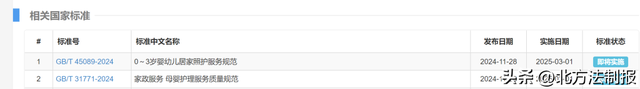 新修订的《家政服务 母婴护理服务质量规范》和《0~3岁婴幼儿居家照护服务规范》两项国家标准已于近日发布,将于2025年3月1日起施行。