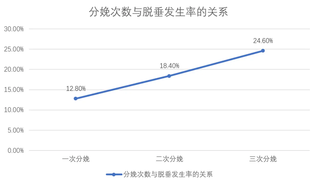 研究表明,盆腔器官脱垂与产次呈正相关,一胎发病率12.8%,二胎发病率18.4%, 三胎发病率24.6%。