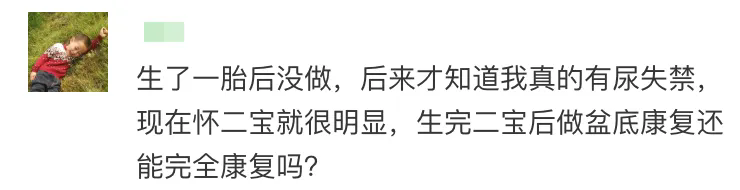 这些妈妈生第一个孩子时大都比较年轻,身体条件好,即使在怀头胎的时候,已经出现一些盆底损伤的症状,比如轻度的尿失禁。但仗着年轻没有在意,到了二胎的时候,尿失禁、阴道壁膨出等逐渐浮出水面。