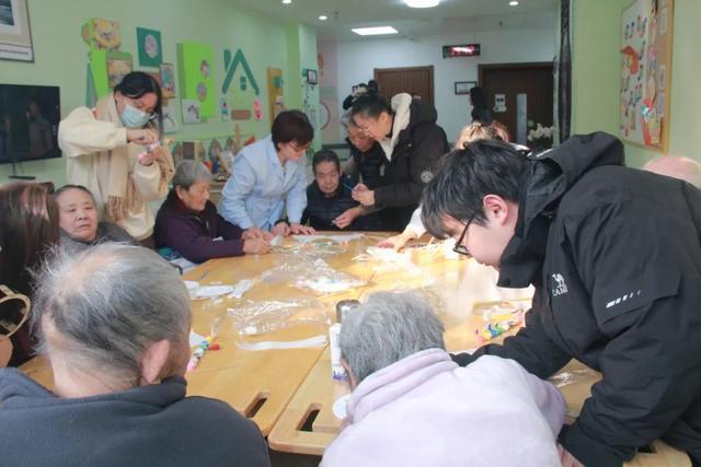 1月3日下午,在真新街道养老院“记忆家园”认知症照护专区,一场手工灯笼制作的活动正在进行中。老人们在护理人员的耐心指导下,或独自琢磨,或两两合作,用各式各样的材料和工具,小心翼翼地将一片片彩纸折叠、粘贴。