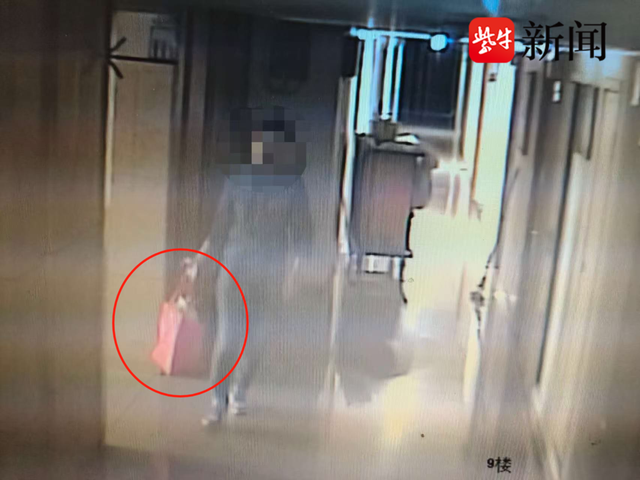 监控显示一男子拿着一只红色袋子走出殷先生的房间