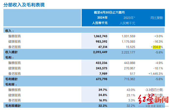 从财务数据来看,今年上半年,养老服务虽然的收入尚有提升空间,为4731.4万元,但同比大幅增长204.8%。另外,上半年医疗服务收入10.63亿元,同比增长3%;健康服务收入9.83亿元,同比下降16.3%。