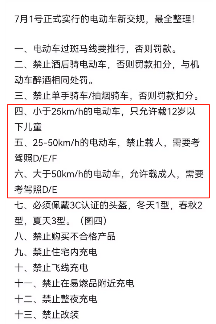严查电动车违规上路,可以说是近几年各地交管部门的主抓的一件事,近期,小行家也关注到多个内容,都提到7月1日起,事关电动车严查的规定,比如这样一份号称“最全整理”,其中就在第四、五、六条涉及电动车载人的要求,而最受关注的,莫过于第四条“小于25km/h的电动车,只允许载12岁以下儿童”。