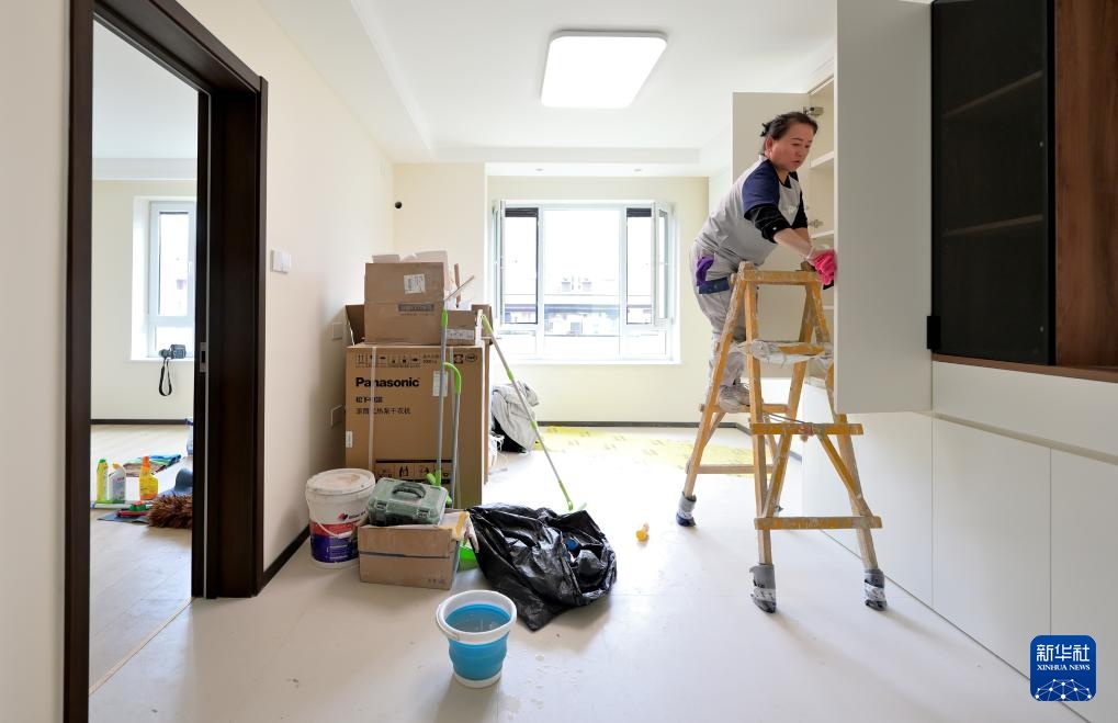 4月29日,在北京丰台区的一间新房内,范汝英为房间做“开荒”保洁。新华社记者 李贺 摄