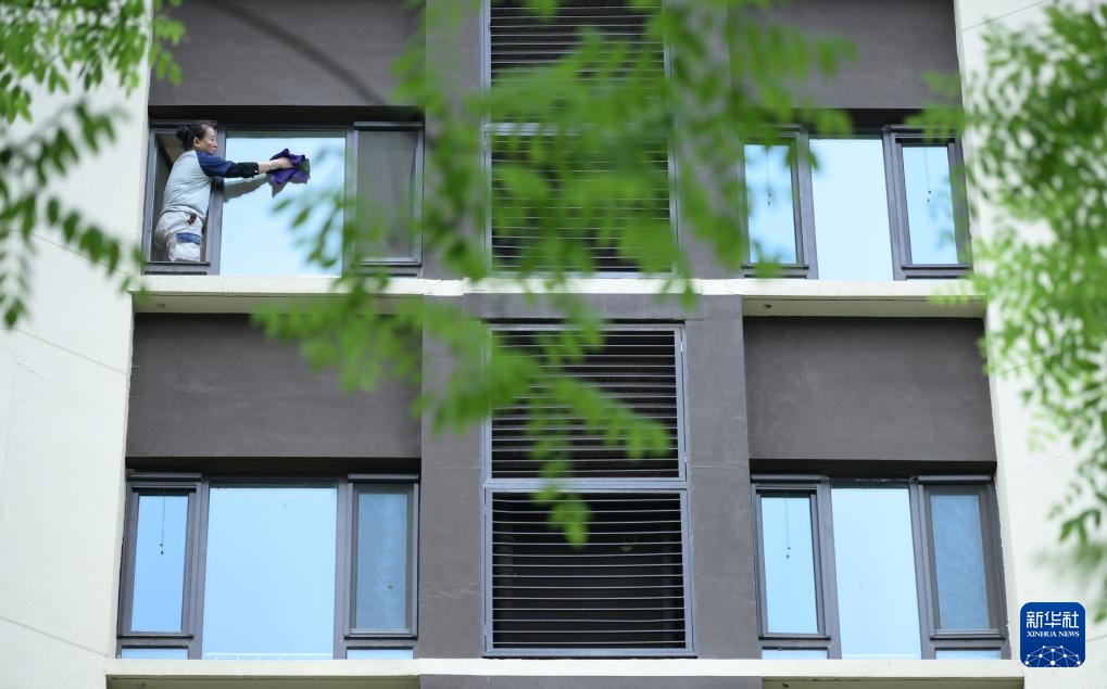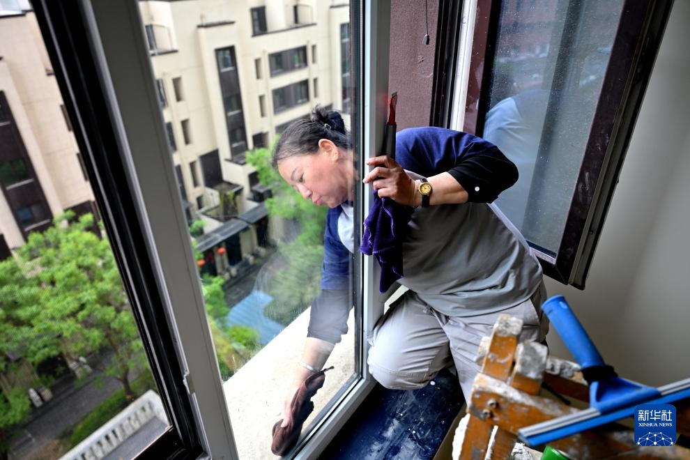 4月29日,范汝英在北京丰台区一间新房内擦拭玻璃。新华社记者 李贺 摄