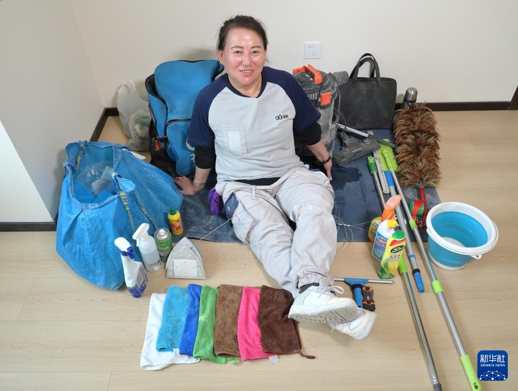 4月29日,范汝英坐在北京丰台区一间新房内展示她的清洁工具。新华社记者 李贺 摄