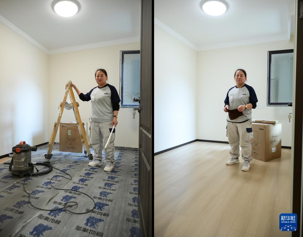 范汝英在北京丰台区为一间新房做“开荒”清洁,这是其中一间屋子在清洁前后的对比(4月29日摄,拼版照片)。新华社记者 李贺 摄
