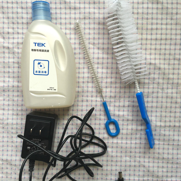 作为一款高端的地面清洗机,她的配件也是如此的精细全面,比如地面清洗液,吸口清洗刷,回收桶清洗刷,拖盘,充电器,滚刷清理工具,说明书。