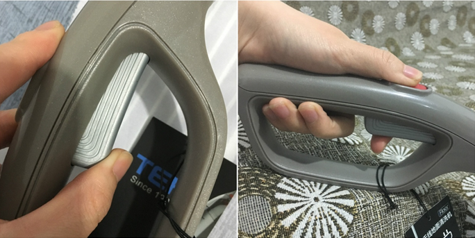 先看看手柄,采用单手握柄的设计,手柄上盖和下盖均采用人体工程学设计,握起来非常有手感,舒适而有力,能够掌控全局。大拇指直接接触整机开关键,只需一下,就可以控制清洗机的运行。无名指直接接触溶液扳机,在清洗的过程中,可以随时控制溶液,均匀释放。