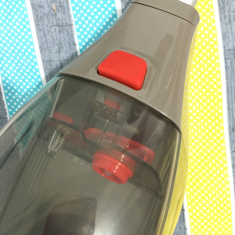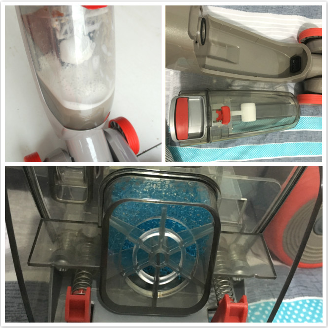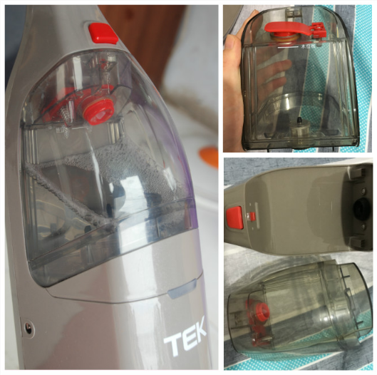 机体下面就是回收桶了,这里大约是600ml 容量,这一部分包含回收桶提手和回收桶释放扣,简单操作,可以迅速把回收桶拿出来或者安装上,环环相扣,很严密的设计。在回收桶里面,有一个水位符,当水位吸到上限时,水位符会启动并堵住阀门,提醒及时清空,当然回收桶里也是很脏的哟,垃圾全部回收这里了,清洗之后,可以看到回收桶里面的污水呢。
