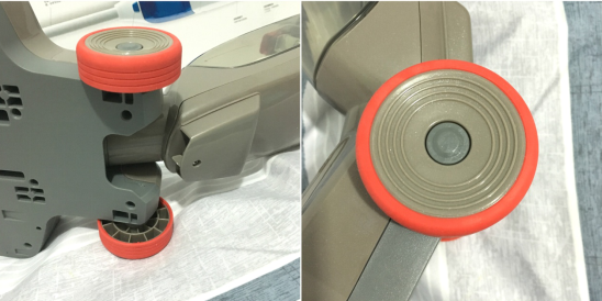 重点来了哦,地刷的设计就像是一个小型机器人,两个红色的轮子自由移动,可以看出来轮子采用的是TPV包胶技术,在工作的时候,不会发出声音,同时对地板起到了保护作用。红红的两个小轮子,越看越漂亮~~